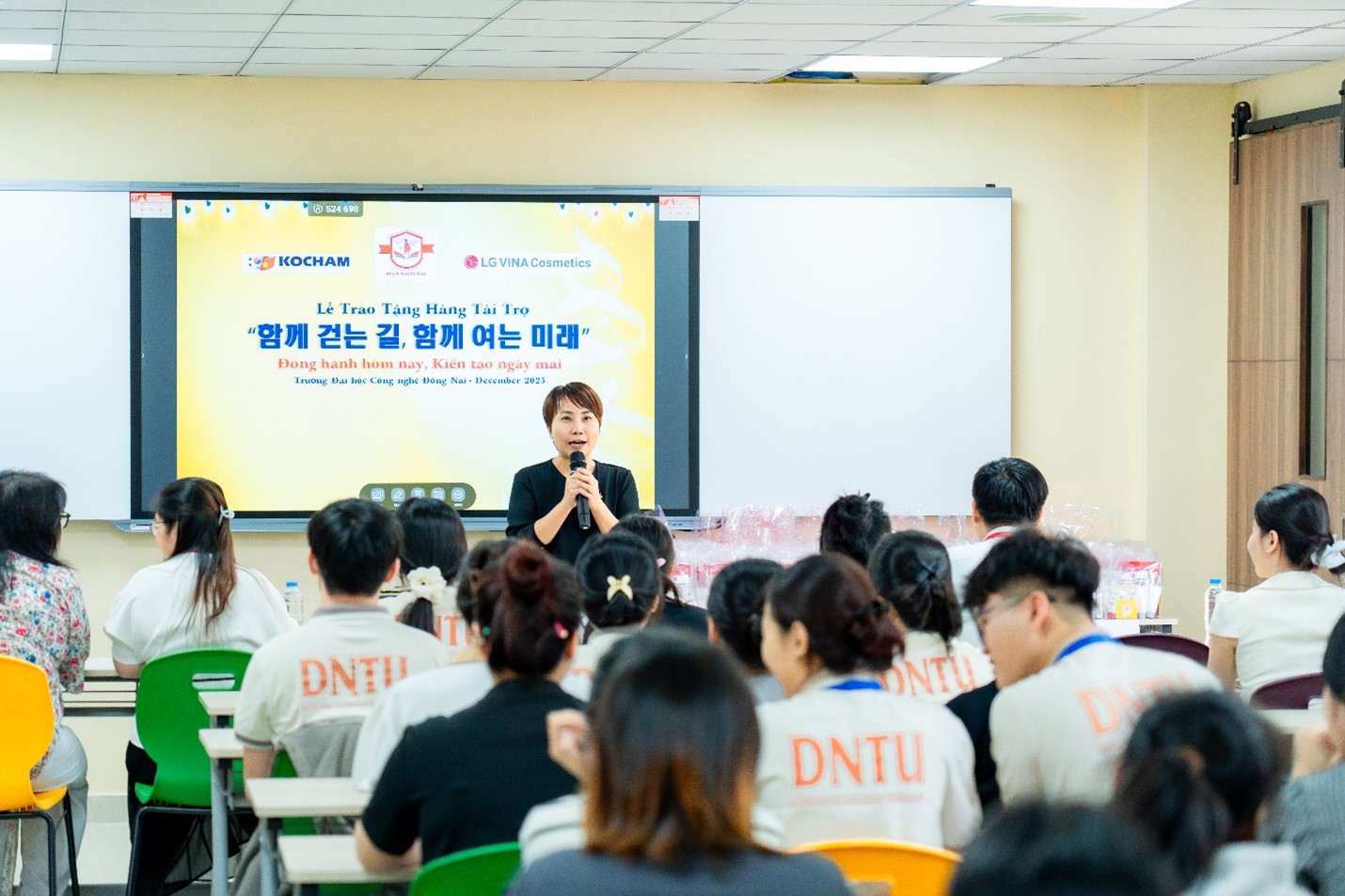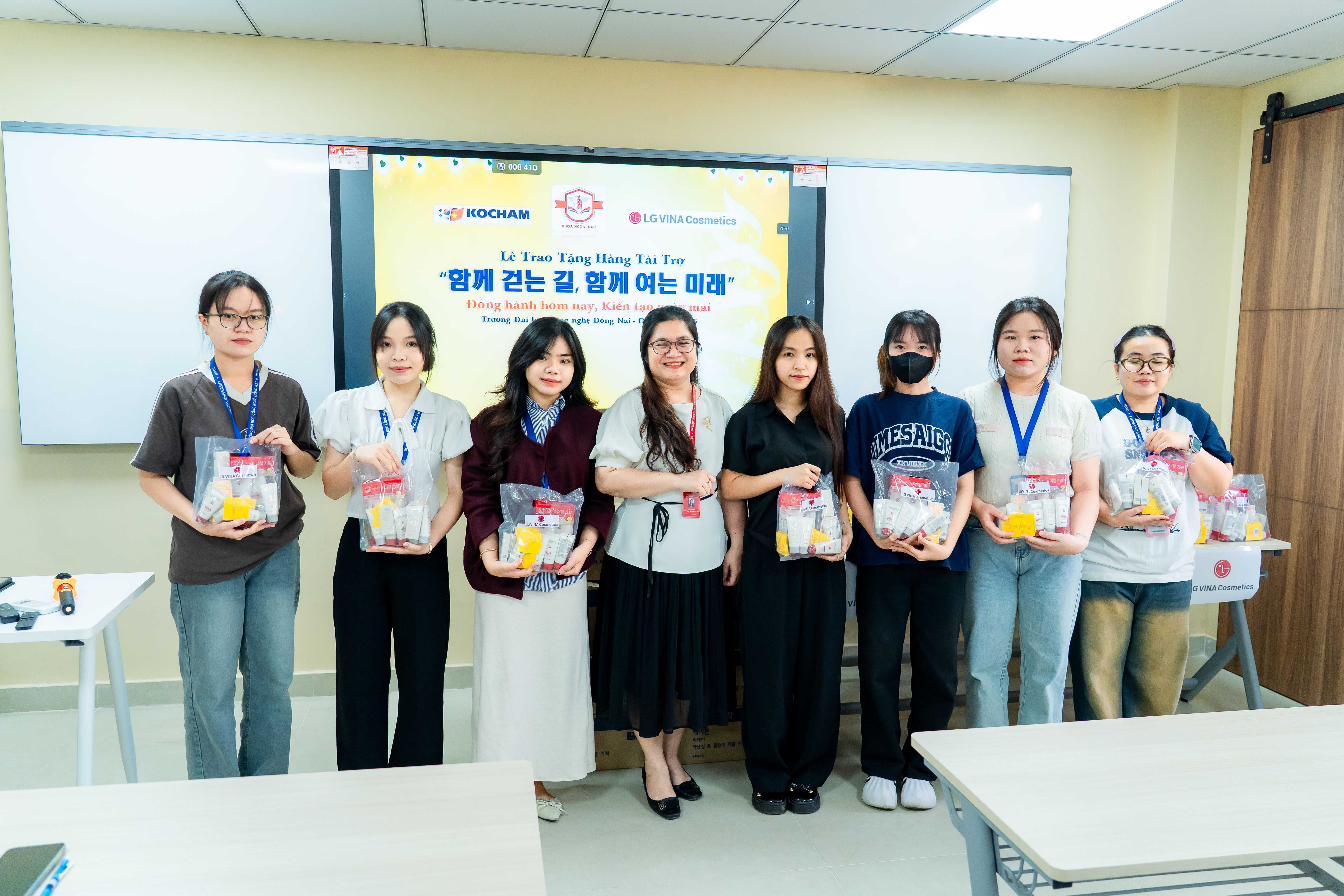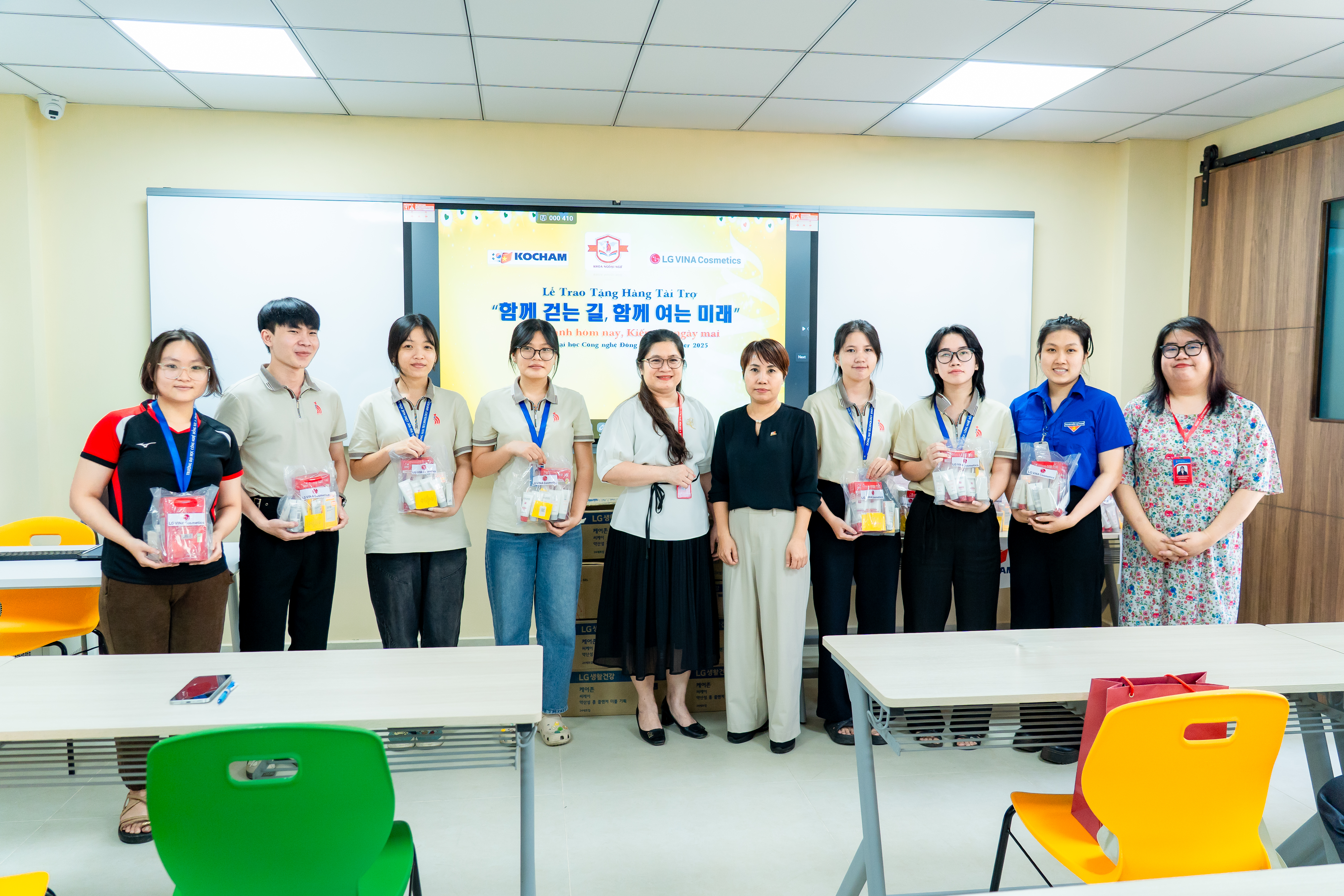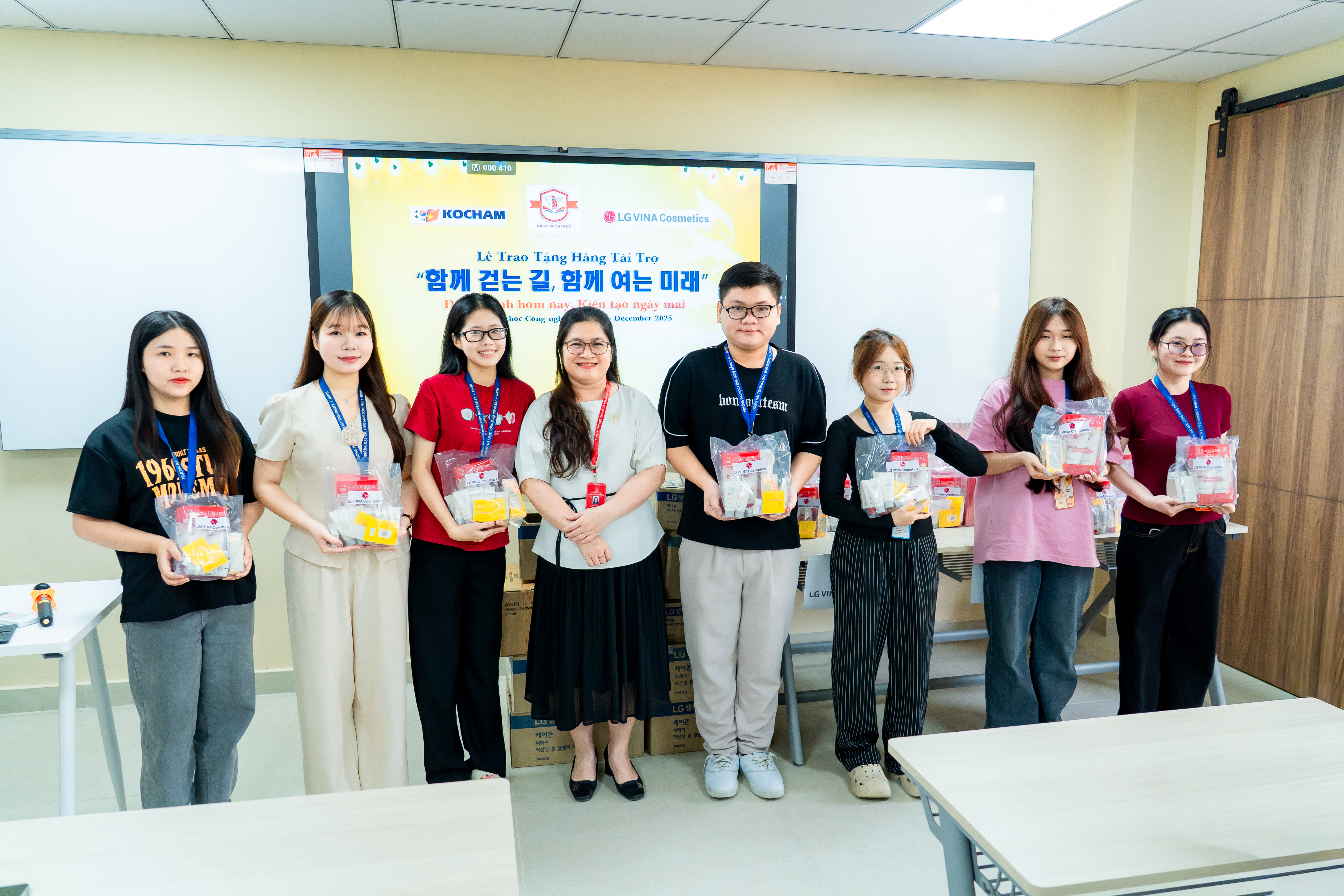 Bên cạnh các hoạt động giao lưu và trải nghiệm văn hóa, Hiệp hội Doanh nghiệp Hàn Quốc tại Việt Nam (KOCHAM Việt Nam) cùng nhà tài trợ LG VINA Cosmetics đã trao tặng những phần quà ý nghĩa dành cho sinh viên ngành Hàn Quốc học. Những món quà thiết thực này không chỉ thể hiện sự quan tâm, đồng hành của KOCHAM Việt Nam đối với công tác đào tạo nguồn nhân lực am hiểu ngôn ngữ và văn hóa Hàn Quốc, mà còn góp phần khích lệ tinh thần học tập, tạo thêm động lực để sinh viên tiếp tục nỗ lực rèn luyện, nâng cao kiến thức và kỹ năng trong quá trình học tập. Hoạt động trao tặng quà cũng góp phần thắt chặt mối quan hệ hợp tác, giao lưu giữa các doanh nghiệp Hàn Quốc và nhà trường, hướng đến mục tiêu gắn kết đào tạo với thực tiễn.